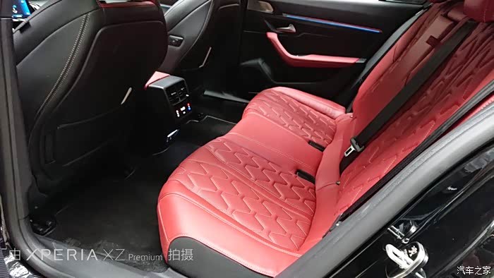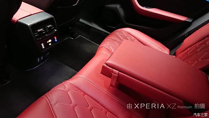 红色的Nappa打孔真皮座椅看着亮眼,坐着也很舒适。后排这个中央扶手也很舒服,很软。