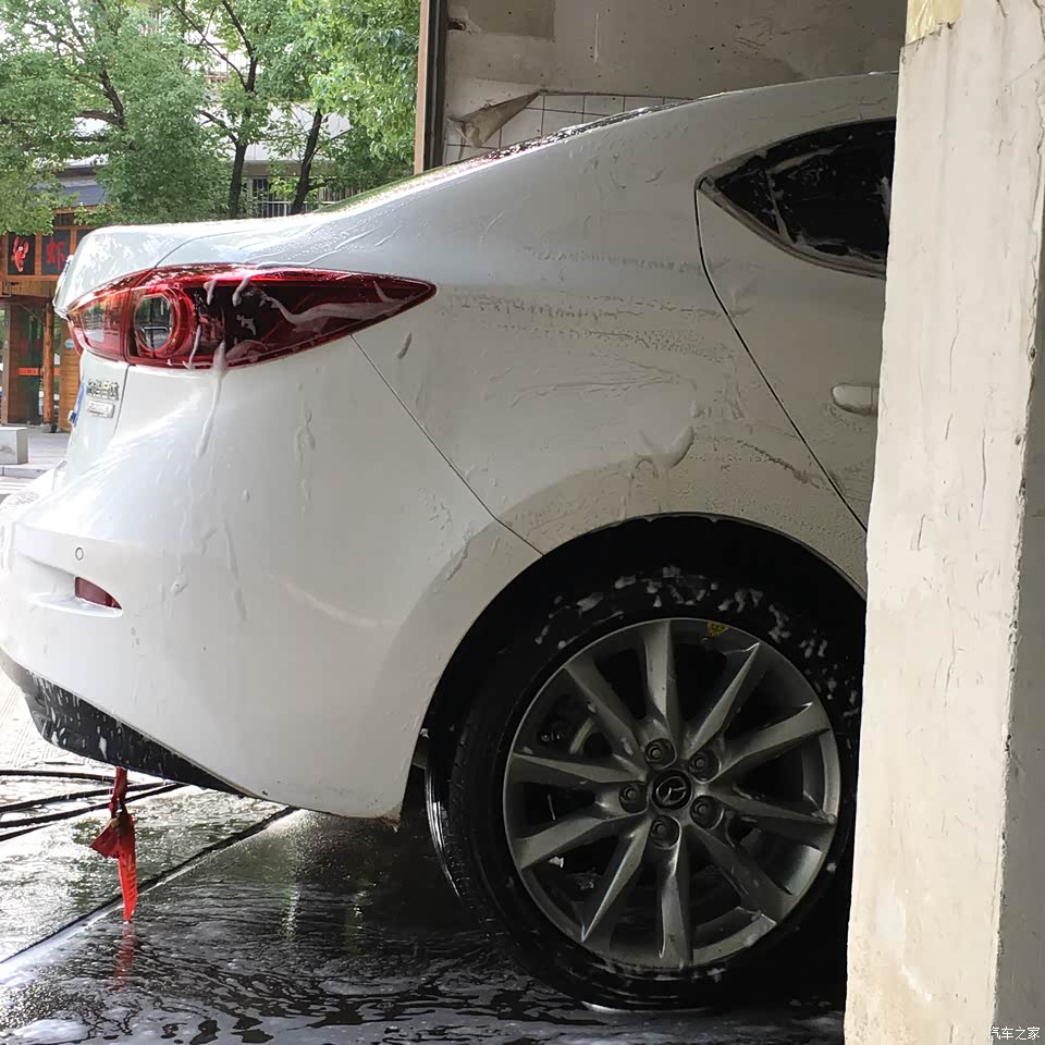 外观的话,没得说,这两条腰线是真的好看,马自达的魂动设计是真的帅气,跟同级比起来就感觉挺犀利的,不过我看cx5的前脸才真的犀利,小马跟他比起来就显的稍带点可爱。大灯和尾灯我是真喜欢,辨识度也挺高,跟阿特兹有点点相似,尾灯点亮后是一个圈的就是小马,是一个圆的就是阿特兹了,说到尾灯,我觉得小马的屁股有点短,还有点翘,跟它的车头比起来有一点点的不协调,不过看久了也就没这回事了。这个珠光白的漆,远看没什么特别,近看还挺亮的,跟高尔夫在一起这个颜色有点偏暖。虽然是18寸的大轮毂,一眼看去真没有一点18寸大轮毂该有的霸气,然后前轮还不放心跑点烂路,款式倒是不错,三箱的轮毂颜色不像两箱版的是银灰色的,那个颜色帅气,另外三箱版的尾气也没给露出来,白瞎我双排了。