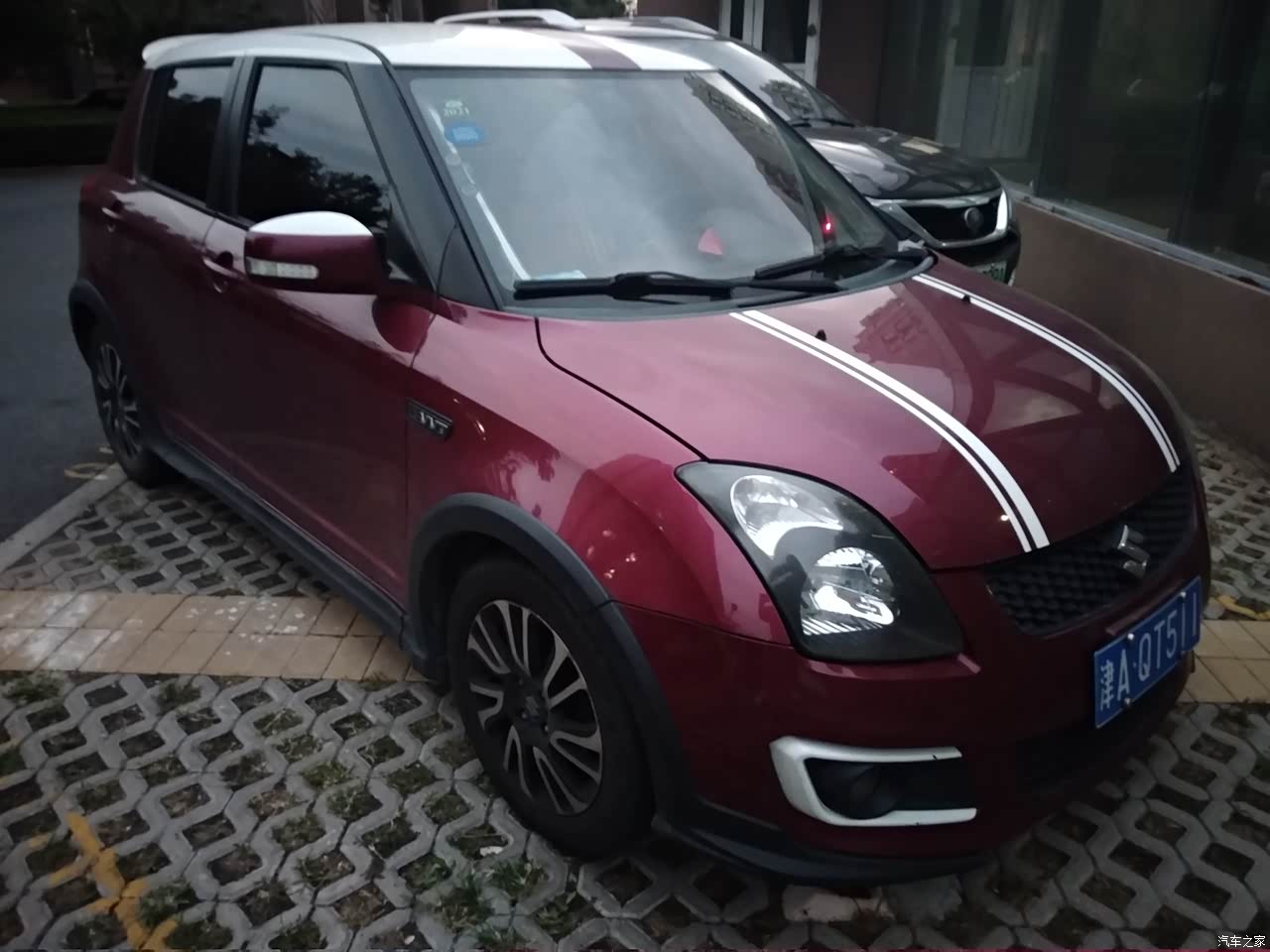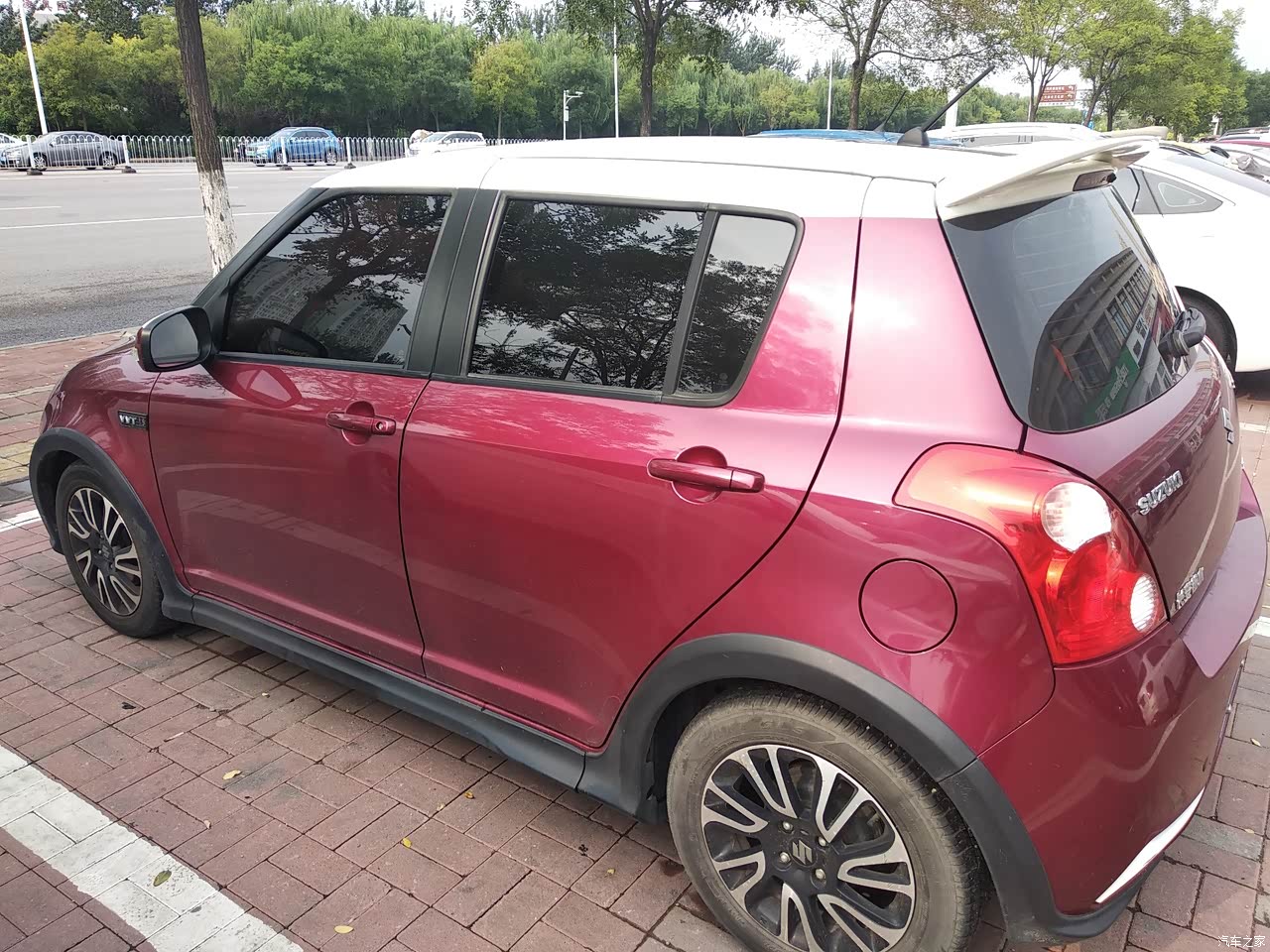 外观很好看,很耐看。一点也不掉价。酒红色,运动包围,白色条纹搭配起来很年轻动感,尤其适合小女生开。车子开在路上的辨识度很高。