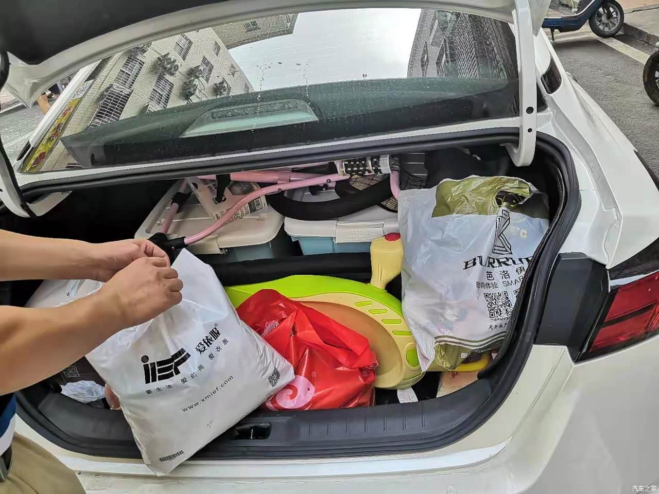 后备箱比较大,中秋节送小孩回去,塞的两个收纳箱两辆小车,基本家用是绰绰有余的