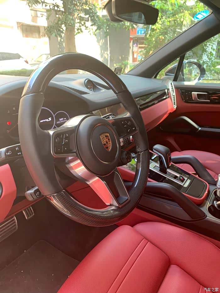 全新卡宴的内饰再创新,没后悔选波尔多红的内饰搭配,运动跑车范提升不少,虽然容易惹尘埃和摸过容易起白膜,但豪华真皮细腻质感非常到位,如果不选真皮内饰的话内饰感观有点差,对不起这价位。而且选配了最好看的碳纤方向盘,即使不好用也耐看。控制台确实不太好操作,个人觉得甚至有些反人类。