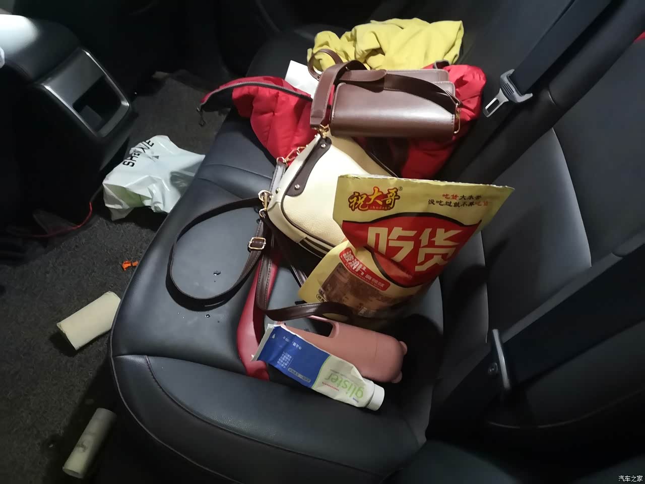 因为本人的个子还是比较高的,不到一米八,坐到主驾驶开车的时候,后面空间可能会感觉有点小,但是家人做进去的时候腿部空间还是比较大的,所以也不会特别的拥挤,这一个给个好评,然后就是后备箱乱七八糟的东西比较多,往后备箱里塞这个的储物的能力还是比较强的,值得一提的就是这个坐在后排的时候,中间有一个头枕,第三个人做的时候不会很难受,然后就是中间有个拉下来的放杯子的东西,也不至于后排坐人的时候没有地方放东西