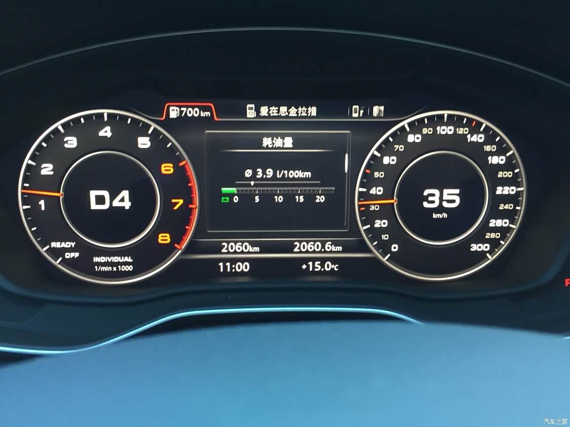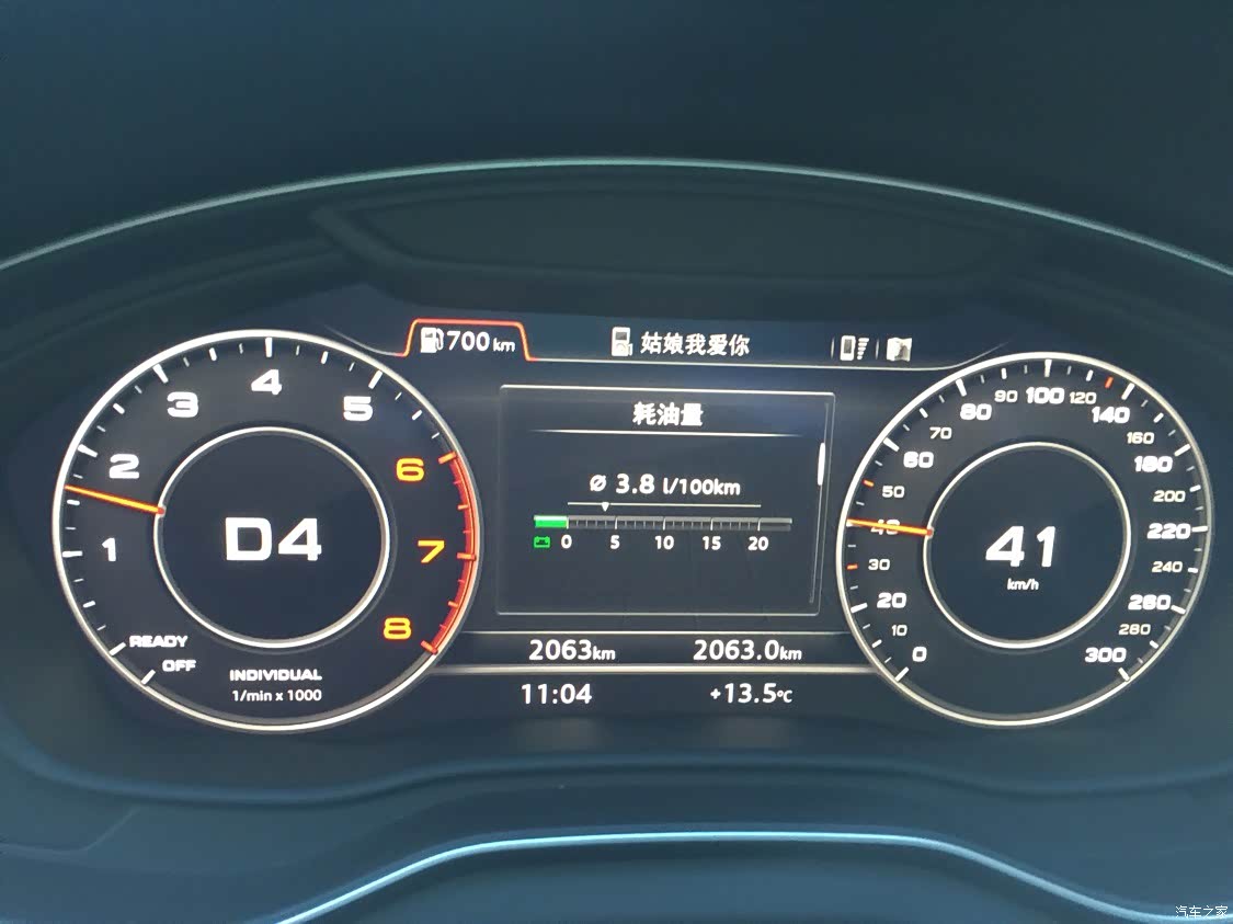 最满意的是空间和油耗,一家5个人坐上去还很宽,比我的09款Polo那就视野开阔到不晓得哪里去了!再来说说油耗:接近1.9吨的大家伙,只要速度大概在40以上,能够一直前进,表显油耗一般在6多一点,那天从康定回姑咱,居然跑到了3.8!我会上图给大家看!还有隔音效果也是我的小Polo无法比拟的,这个油耗和隔音我可以打95分!老款q 5坐过没有开过,无法对比,但是对我上下班和节假日带家人出去耍这个诉求,新款q5l完全能够满足我们一家了。白色是除了我以外全家人一致的选择。