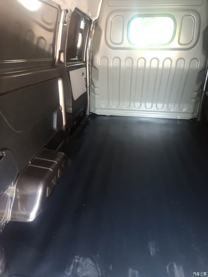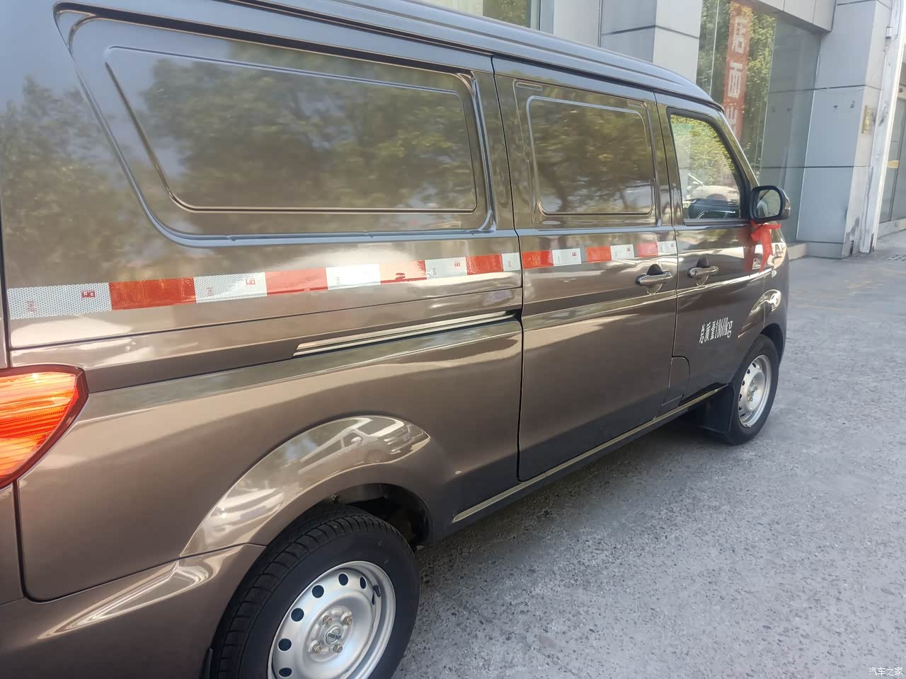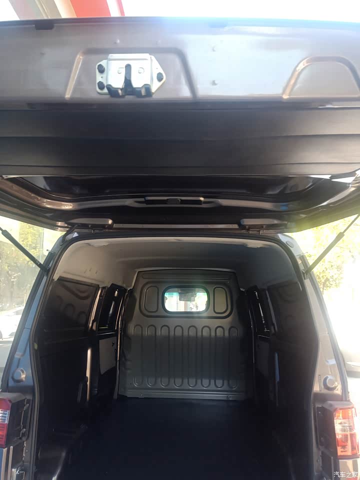 外观还不错吧,买的是深棕色的,颜色耐脏,挺喜欢他这个标志的,和这个前面配一脸。后面是盲窗的,里面放的货比较多,从外面看过去也不会那么乱。即使是晚上开,安全系数也是蛮高的,反光条把车围了一圈,简单大气。