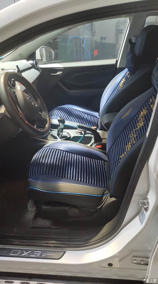 虽然黑色内饰看起来有点沉闷,但是小三在中控的设计上很有层次感,而且用到的软材质较多,所以给我的感觉也不是很冰冷,有点酷酷的温馨感觉,加上4个圆形十字的大出风口,很有运动感觉的视觉效果,加上我的蓝色坐垫就更有运动风了