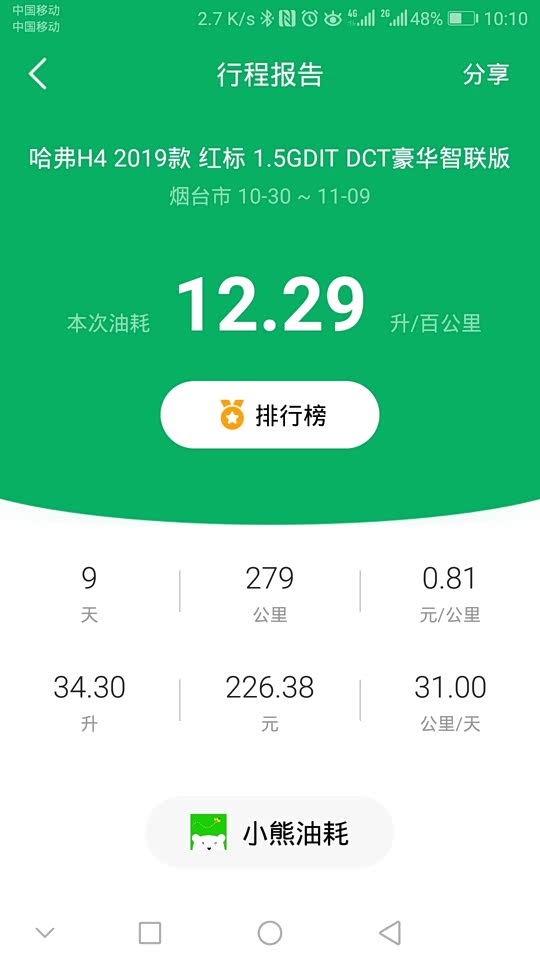 小熊油耗计算输入今天的加入量,油耗12.29升/百公里,一共加进去34升油,
