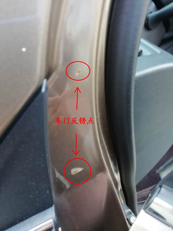 门子也掉漆了,多出反锈点,与车框的关合处还有磨损掉漆,胶条不好。