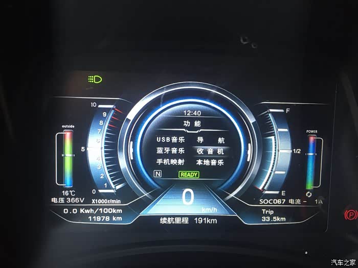 搭载7英寸液晶显示屏,上面内容很全面,剩余行驶里程数,剩余电量,时速,百公里耗电等等