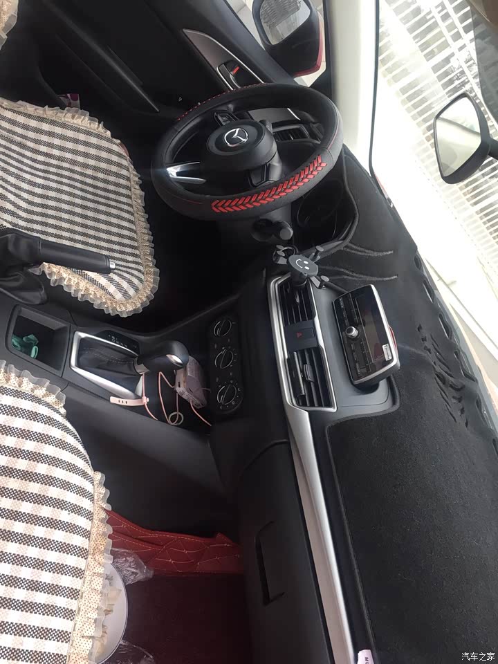 内饰比起我们看的其他品牌感觉要好一些,中控不是大塑料感,而是软的,比较上档次。就是中间杯架的设计不大好,放个高点的矿泉水瓶挂前进档就有点碍事了