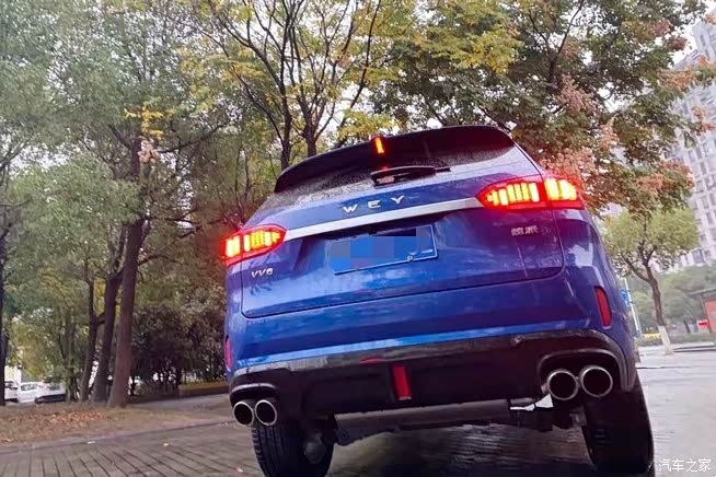 魏六给我的外观感受就是非常时尚,特别是蓝色车身,车漆光滑细腻,配上这个仿豹式的车身设计,vv6身上也有运动风格,19轮大轮毂,四出排气都是比较运动的。
