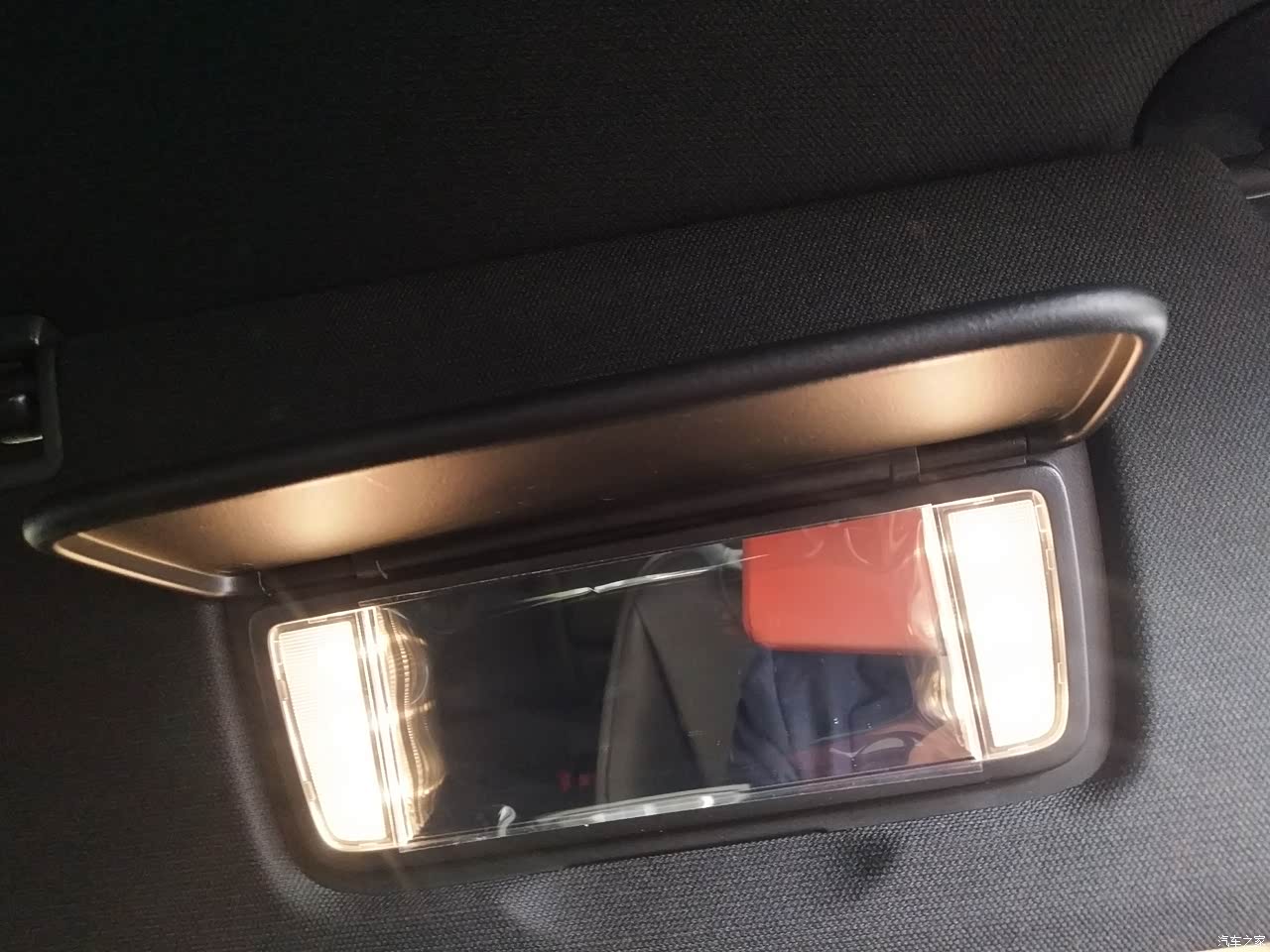 内饰简单大方,早上送媳妇去上班她现在基本上都是在车上化妆,这个车的镜子旁边有两竖列灯,很方便女士化妆用。