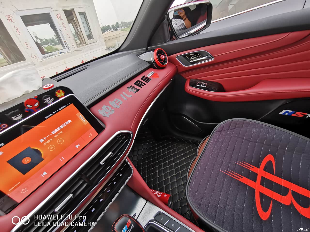 HS的内饰有高级感,左右两侧的空调出风口非常好,把控制方向、调整大小等功能集成在中间的一个小旋扭上,非常方便又漂亮,涡轮的造型也很有运动气息。斑马系统,智能网络控制,我媳妇最喜欢这车的中控台部分,觉得显示屏的设计从侧面看上去非常好看,有种科技感。红色外观对应红色内饰,是我的最喜欢的!