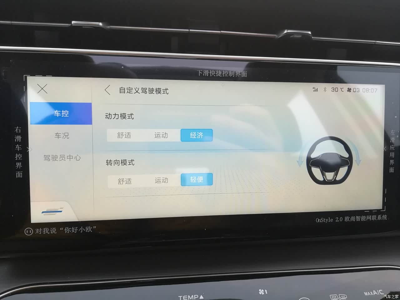 转向没什么虚位,指向准确,方向盘力度提供三种模式选择。