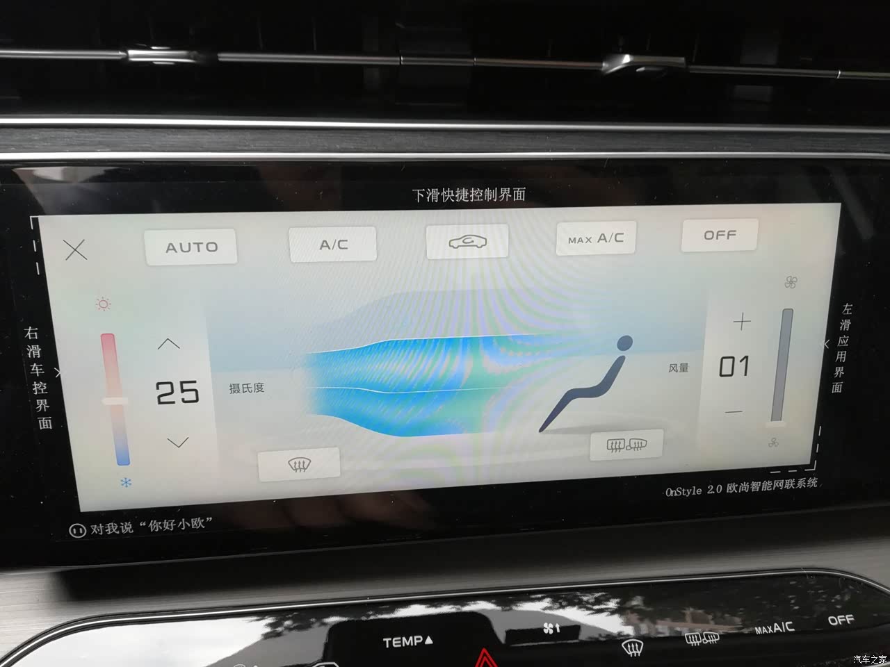 空调控制可以通过中控屏,中控按键以及语音控制,最开始吹热风有点异味,目前已消失。