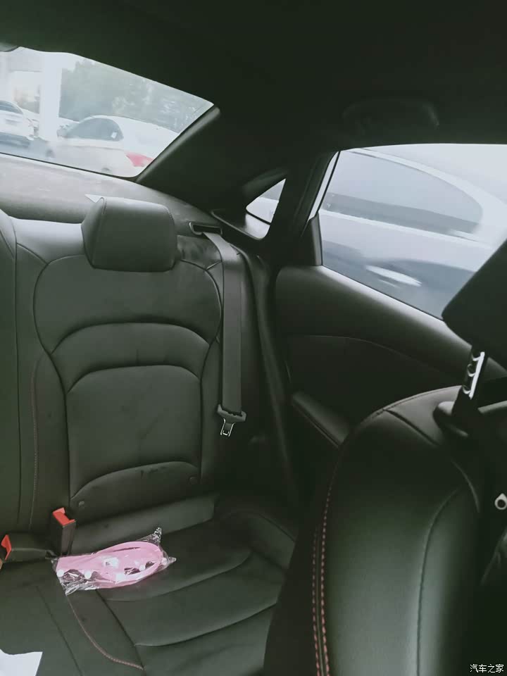 内饰看起来很柔和,车顶是跟车座椅一个颜色的,红黑线缝合,运动气息很足