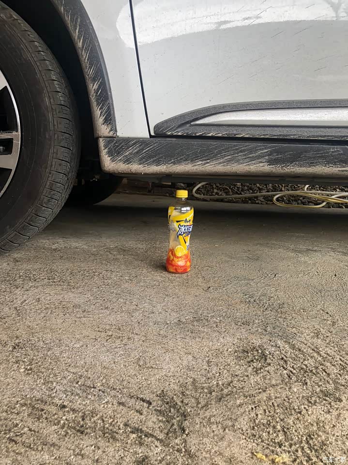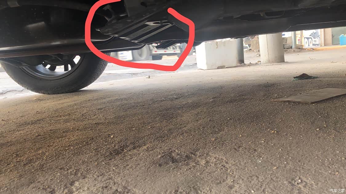 这个地方离地间隙最低,或许是滑倒这个位置。蹲下底盘也看不到哪有有伤痕,等首保去升起来看看了。