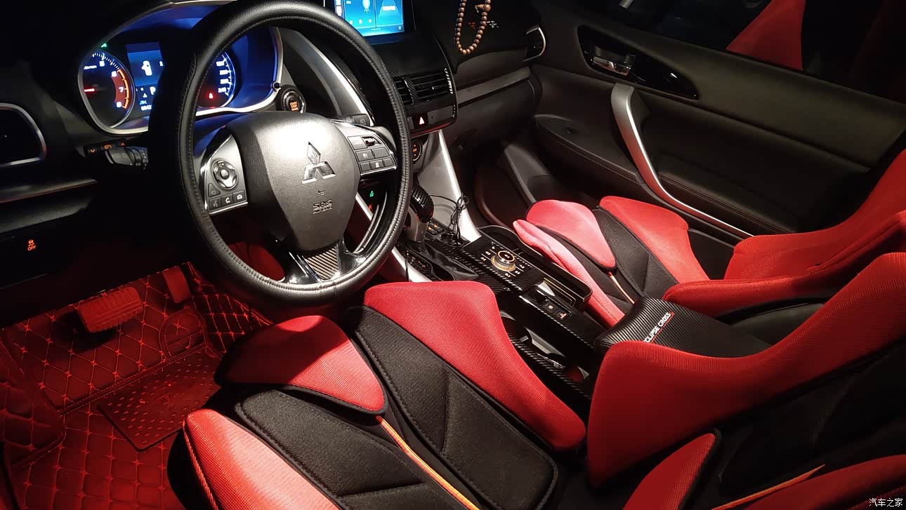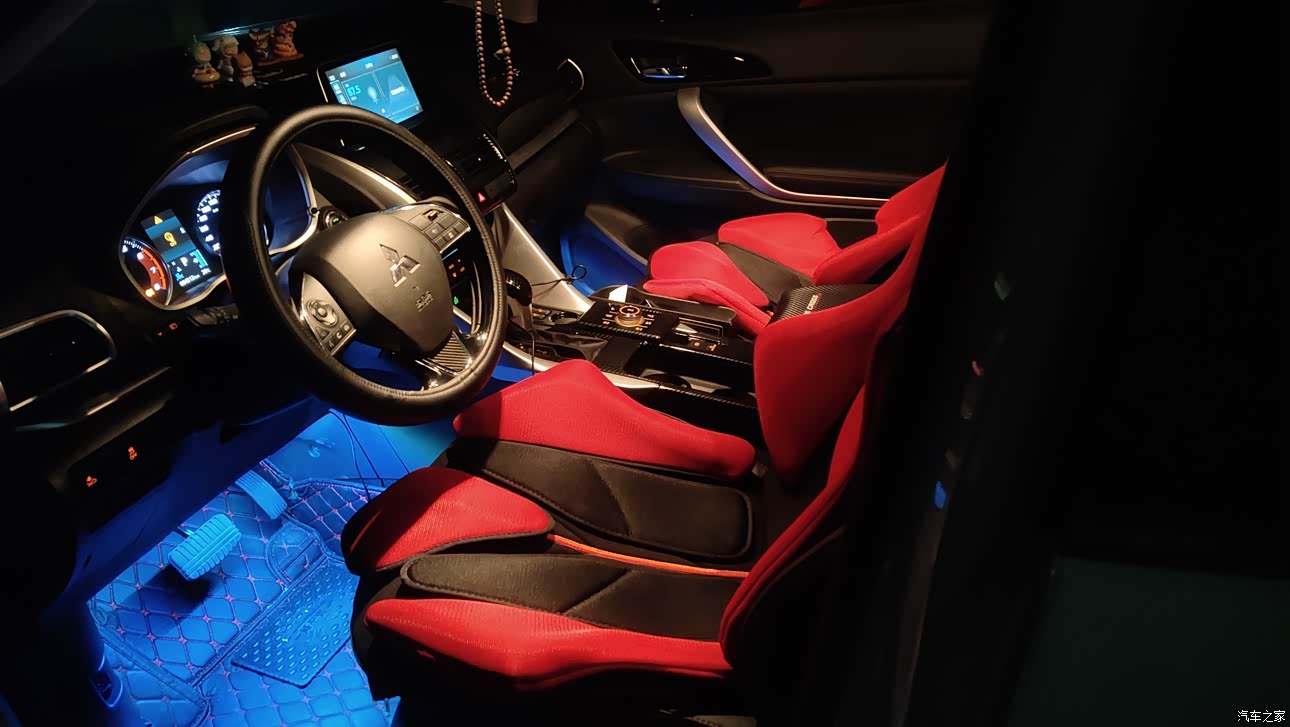 内饰很棒,很多人吐槽三菱内饰丑,我只想说你眼睛被炮打了吧?你这么有审美怎么不请你去做设计? 回归正题,加装赛车座椅套,还有加装碳纤维与灯光,还是很帅的。 还有很多种灯光颜色,懒得拍了。