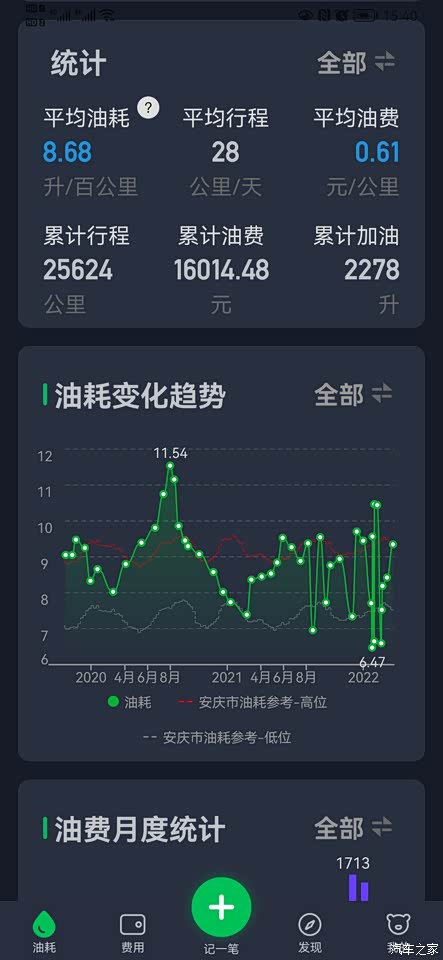 油耗偏高,但是我能接受,可能是我喜欢用ACC,急加速急停有关系。比刚买的时候有所下降,我都用小熊油耗记录,汽车显示油耗比实际油耗低了13%左右。