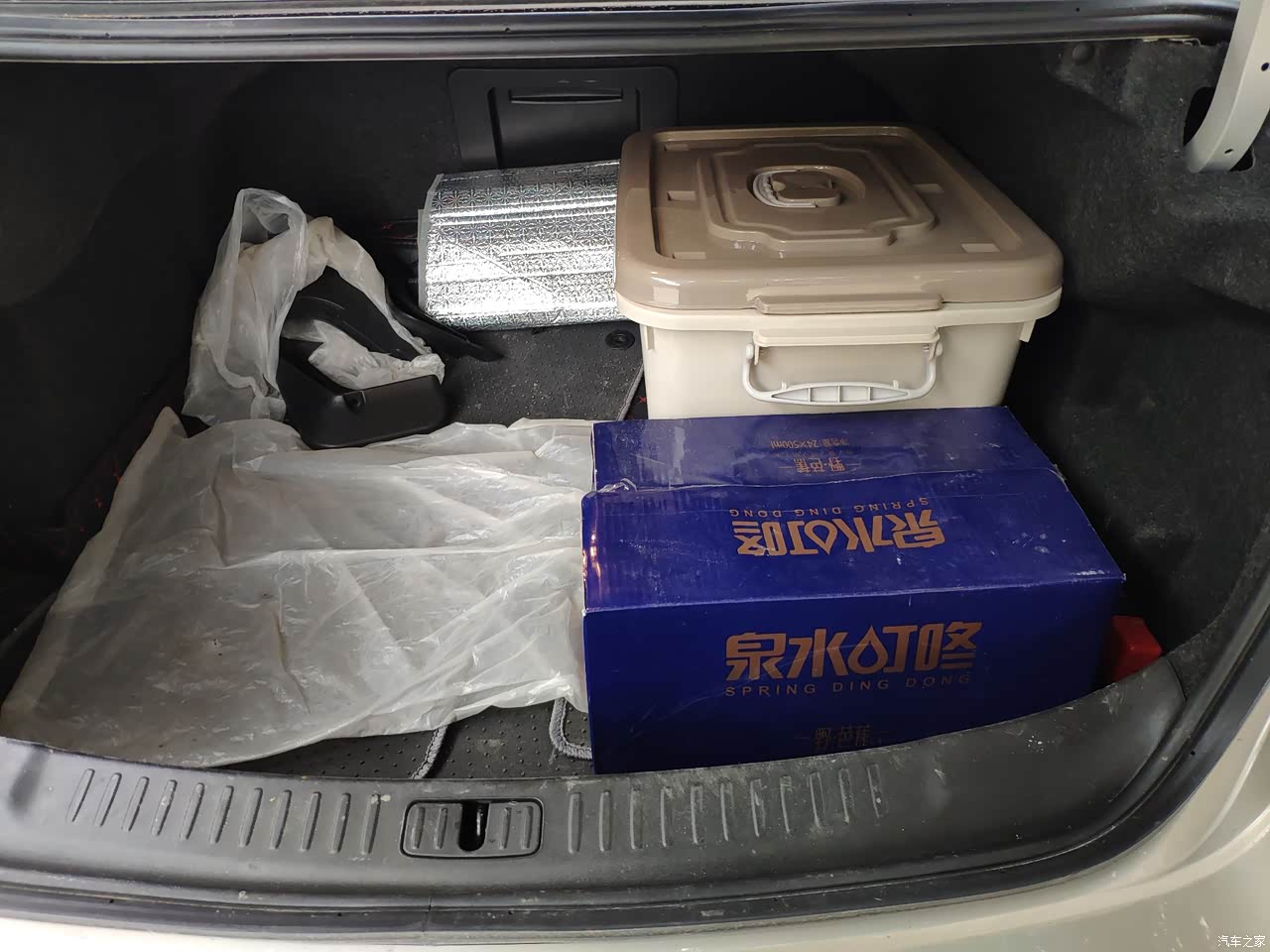 后备箱相对大,一个皮箱,一个收纳箱,还有一件水,平躺着还有一些小位置,