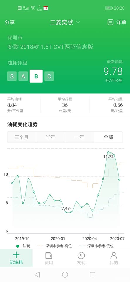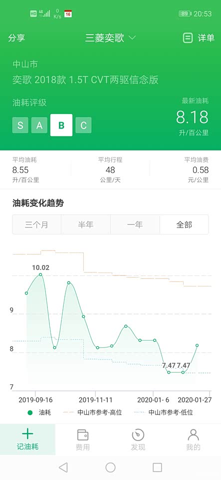 油耗满意,高速7个多油,半年来平均8.2个油,最早的时候出现过一次油耗12L多,是因为加了太便宜的油导致,从此不敢贪便宜。