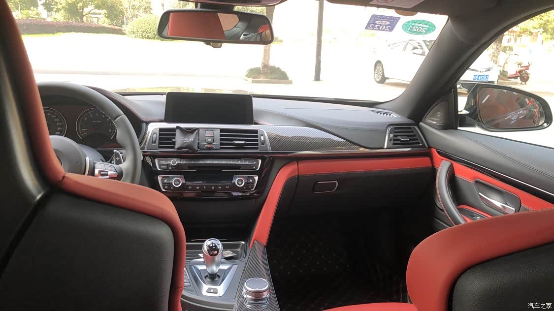 M4虽然内饰和其他宝马大同小异...但是皮质真不是其他能比的 小羊皮那手感...啧啧啧 朴实却很精致 几块炭纤维面板也时刻告诉车主 不能忘记M Power运动的纯粹基因...很可惜的是 车上没看到alcantara...准备去换一个GTS方向盘 真皮+碳+alcantara 这才是性能车该有的内饰!