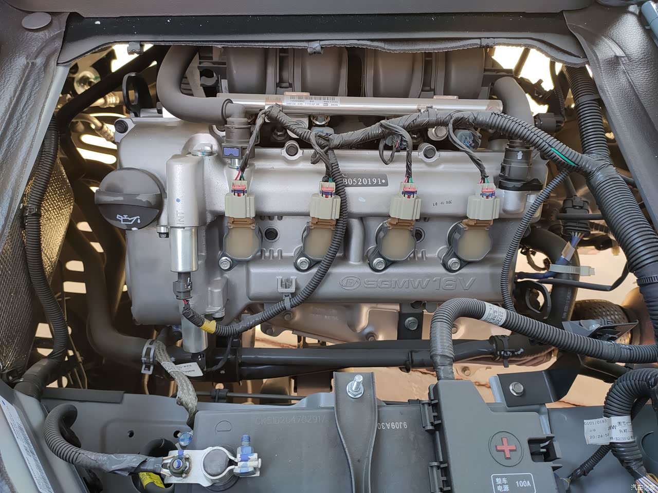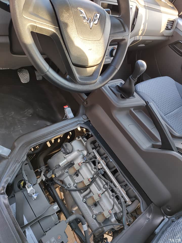 发动机,在座椅下面,拍个照片还真是不容易的哦。SGMW原厂制造,看见标志才放心。发动机照片,在座椅的下面,不会特别脏,工地本身就是灰尘比较多。但是冬天座椅会热乎乎的,就是不知道夏天会不会很热