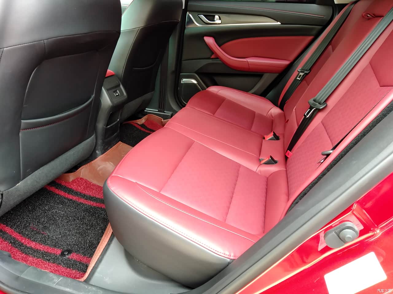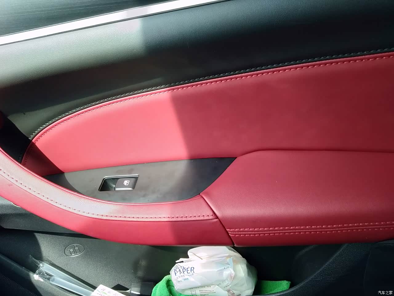 内饰也很漂亮,红色的内饰,给人一种很喜庆的感觉,而且门板都是皮质的,很方便擦洗。搭配银色拉丝面板也很有质感。