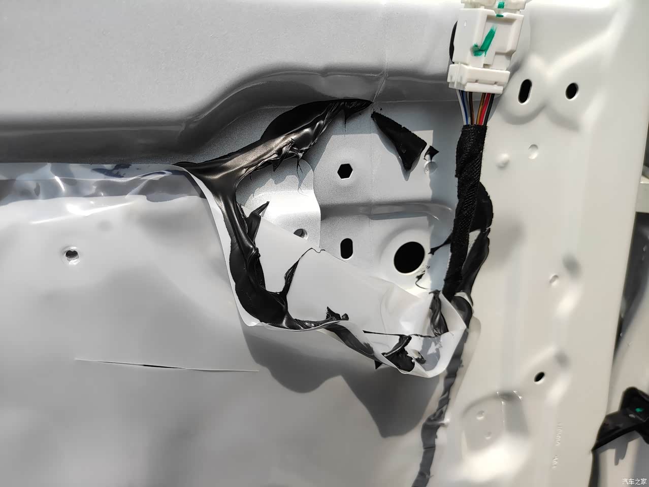 就是这个圆形的大孔渗出来水,防水膜也没贴牢固,水顺着防水膜往外流,4s店重新弄了个橡胶圈把孔堵住