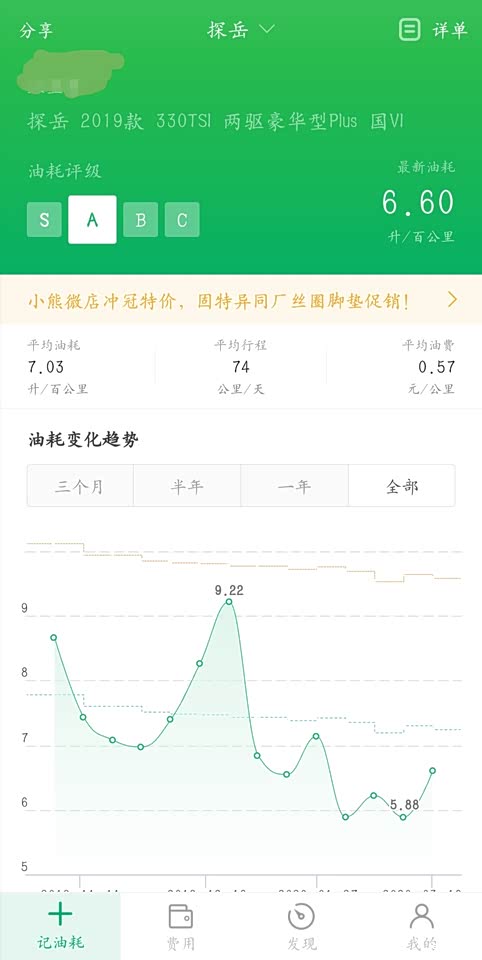 一箱油轻松跑800,悠着点开900以上,相当惊讶! 刚买对探岳不是很熟悉的时候,油耗不低,一箱油700公里左右感觉很欣喜,毕竟2.0的车! 后来开久了,熟悉了,慢慢发现原来更省油,因为跑高速和郊区路较多,再者比较喜欢用定速巡航,一般开到100左右,一箱油轻松上800公里! 疫情期间路上车少,事情一般也没那么紧张,试着定速到90,开出过一次919,一次929!