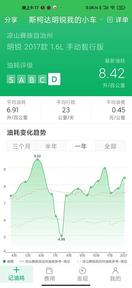 这几年每次加油都作了记录,差不多就一公里要四角左右。