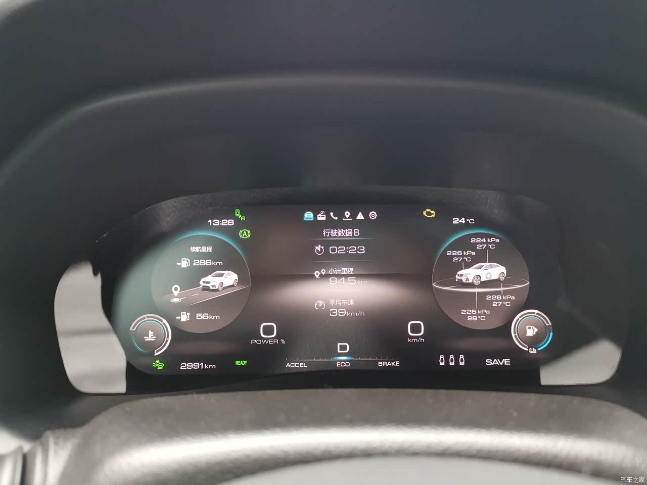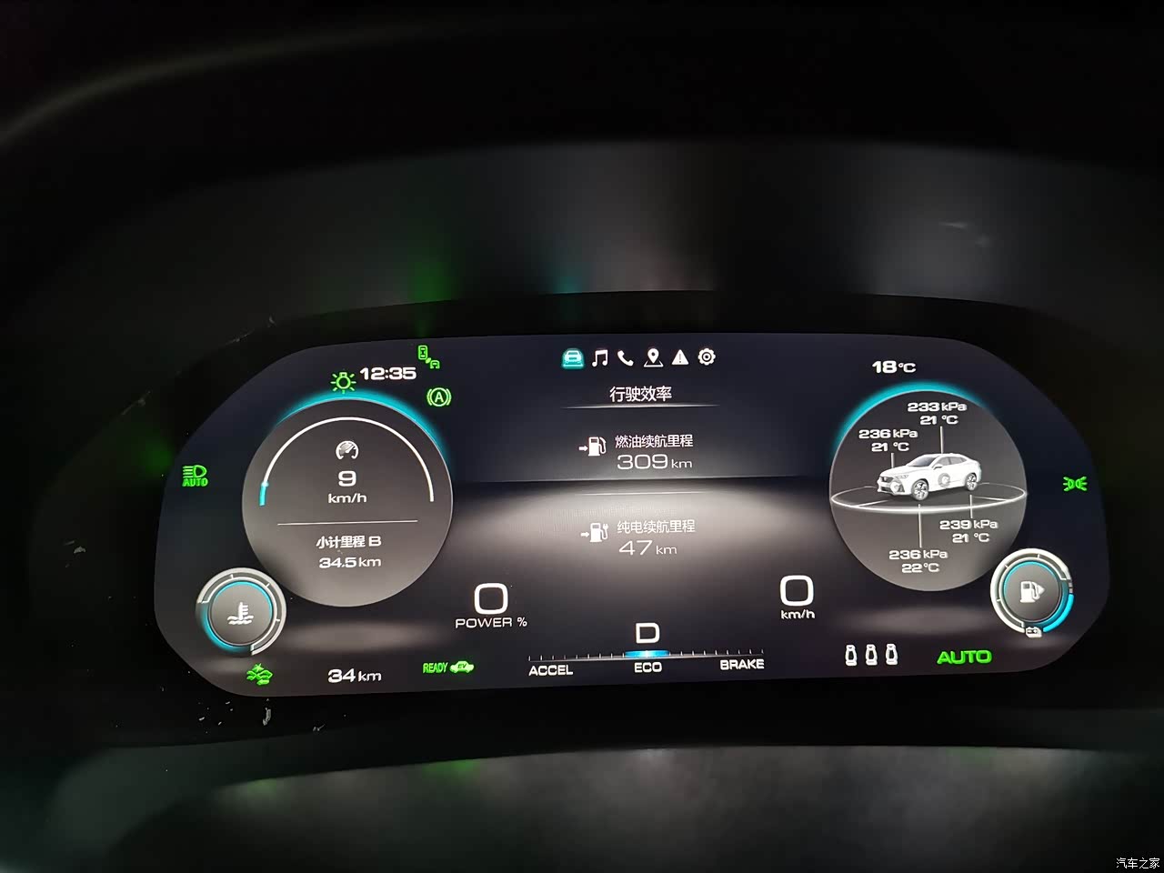 从4S店开回家附近的加油站是纯电行驶,共计跑了9公里,掉了两格电。油箱从完全无油到显示完全加满竟然才38L多一点,不知道咋回事。显示续航纯电47公里,油能跑309公里。之后测试一下再发个口碑。