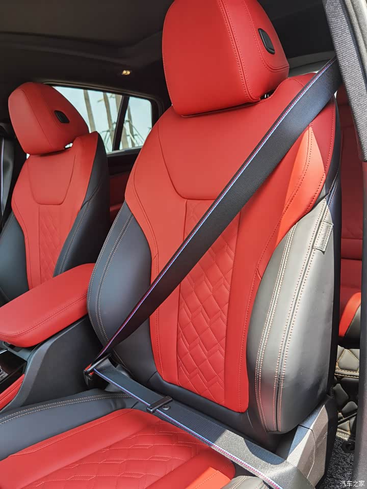 黑红色的内饰有着极强的运动风格,让人一坐进车里就激情四射,有种驰骋沙场的冲动。碳纤维内饰板使豪华感提升不少。座椅是红色的Merino真皮,据说在宝马的大部分车型里,最贵的就是Merino真皮,这种皮质特别细腻柔软,也是宝马内饰顶级奢华的代表,往往选配了Merino真皮才可以选配到座椅的通风功能,原因是Merino真皮的透气性特别好。