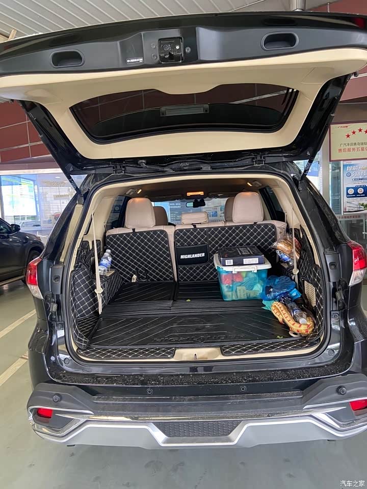 汉兰达让我最满意的是它的空间大,尤其是后备箱和后排空间,平时的时候第三排座椅是放倒的,第二排可以调节到达空间,我媳妇都是翘着二郎腿坐在车上。第三排的座椅也不是摆设,第二排稍微往前调节一下,第三排坐上也是轻轻松松,毫不费力,大爱!现在媳妇也怀着二胎了,以后拉着老婆孩子带上老人一起去旅个游,度个假是不是很悠哉啊!后备箱空间也很大,把第三排座椅放倒,这容量也是超赞!优点就是一马平川,像飞机场一样,放东西很方便,但是也有缺点,缺点就是一马平川放小的东西容易到处滑,尤其急转弯还有急刹车的时候,晃荡的有点厉害,只能说各有利弊吧!
