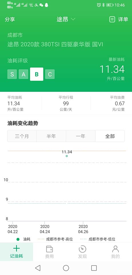 目前表显油耗10,实测油耗11.34,高速很省油油耗8.1。期待后期降到10,可能不太可能,还是有点小梦想。