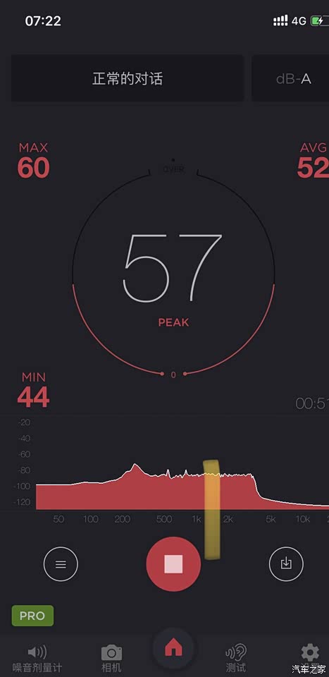 如图,这是怠速的时候的噪音,高速的时候噪音基本上68,69了,算是比较吵了。数字只能是表示大小,主观感受还和噪音的种类数量有关,如果单纯的一种噪音和很多种噪音混合在一起,感觉还是不一样。好一点的车就是单纯的路噪,其他声音基本没有,其实声音也不是很小,但是单纯的噪音会感觉好很多。这个车的噪音就是比较多的那种,路噪,风噪,发动机的噪音,混合在一起,所以很多媒体在测试噪音的时候,只是显示一个峰值没有频谱,觉得还是不太靠谱,很少的媒体人会表达噪音的种类。这个其实真的挺主观的一个因素,如果有频谱分析就比较客观一些。
