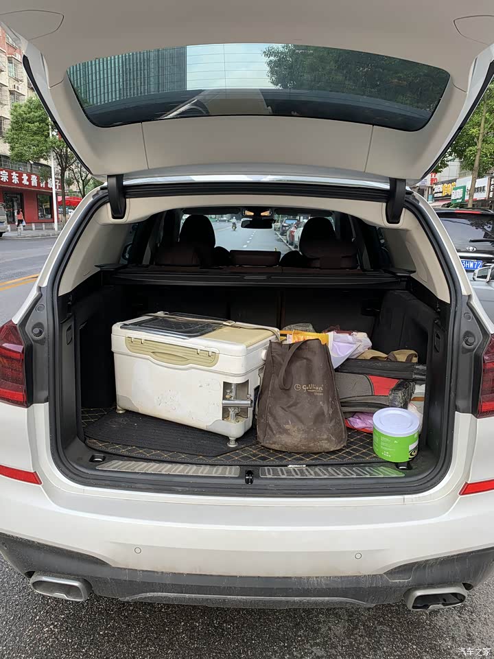 感应后备厢使用方便,上方有隔板,乘座空间与后备厢储物间可隔可收,任君选择,使用方便。因我爱好垂钓,需要放钓杆伞包等渔具行头,空间略显狭小,后备厢零乱也是当然的事。
