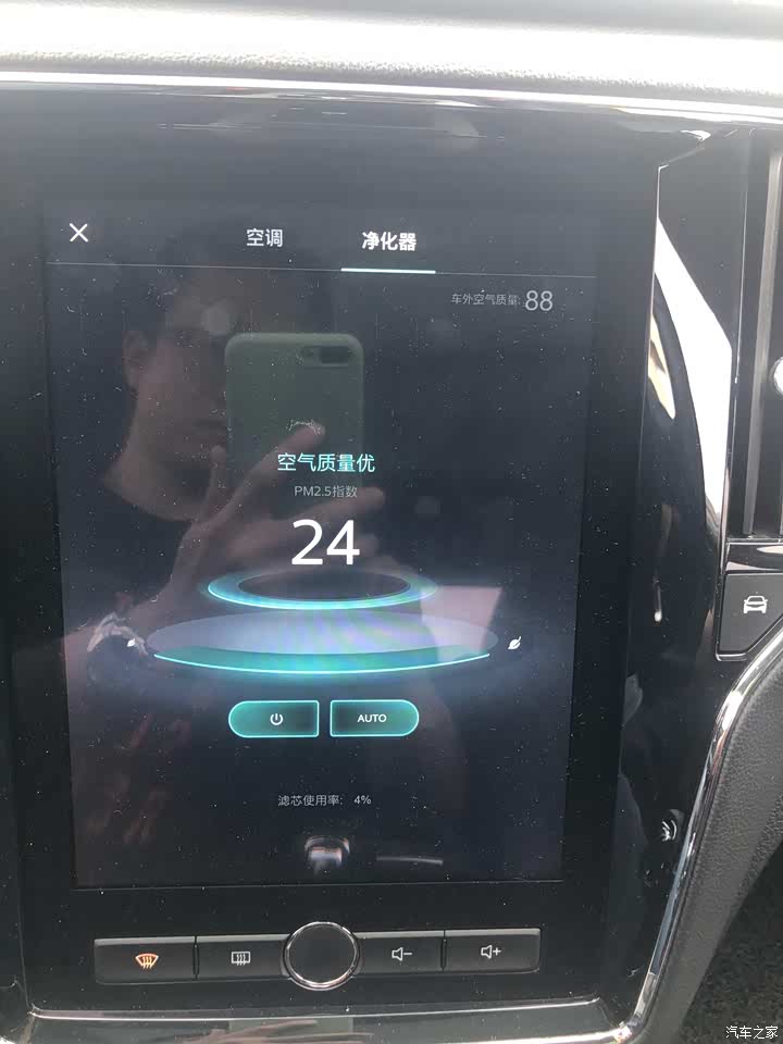 小e的中扶手上有air clean功能,可以监控车内空气质量,一旦发现pm2.5超标就自动开始工作,指示灯由绿变黄,直到净化完成才又变绿。