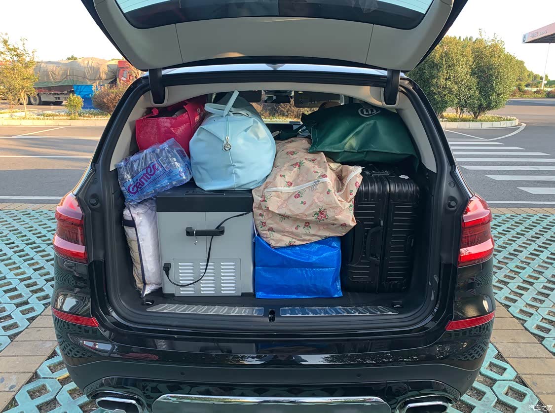 给大家参考一下后备箱,一个40升冰箱,28寸箱子,三个枕头两床被子,一个超大号行李袋,蓝宜家袋子装满