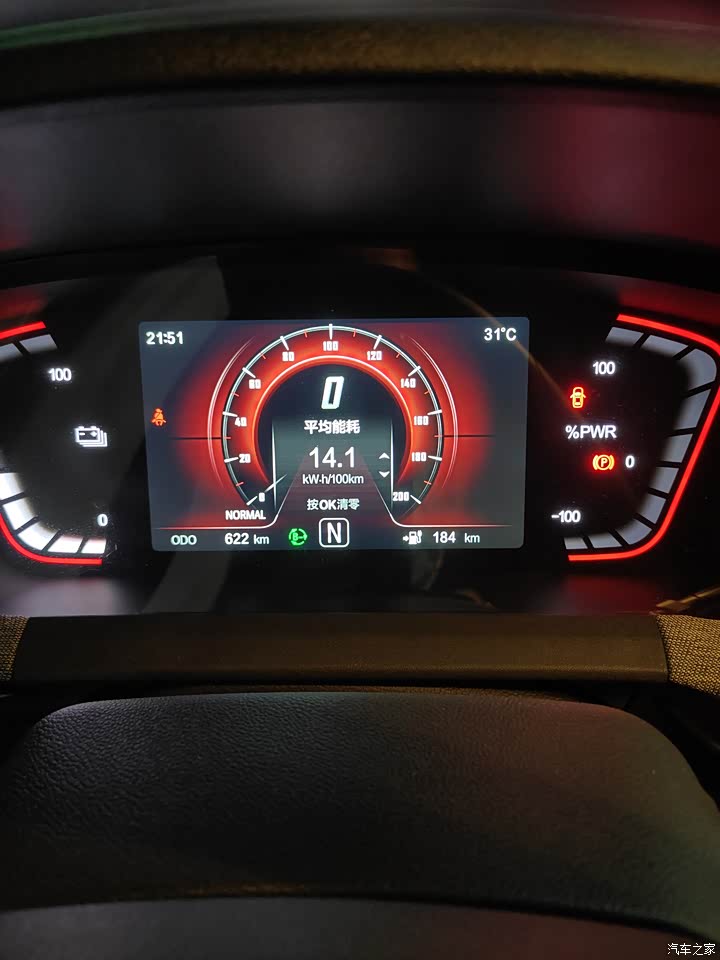 这辆车的主要用途是上下班,上下班来回有60公里,包含20公里高速,30公里快速路,10公里主干道,已经跑了622公里,行车仪表显示14.1千瓦时/百公里。油门不敢踩得太猛,因为踩得猛,速度是很快,但掉电也快。车速超过100之后,掉电也是有点快。新能源E-Pro有D档和E档,都是前进挡,E档有些区别,松开油门是E档会强能量回收,并且刹车灯会亮起,有明显“刹车减速”的感觉,但刹车片没有工作哦,这个功能挺有用的。刹车灯会亮起可以提醒后面的车,会减速同时能量回收,而且不会磨损刹车碟,刹车碟的寿命也会更长。在城市经常需要刹车,E档还是非常实用的。