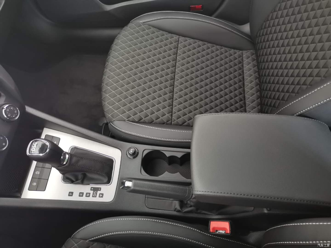 中控台上有两个放水杯的地方。后面还有个手套箱。