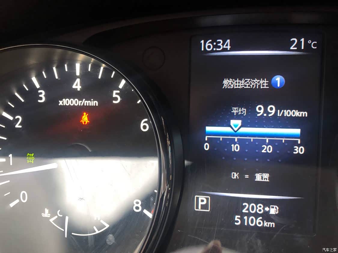 说到了油耗,虽然是2.5四驱,但是省油这个优点也不是盖的,可以看下我的仪表盘,一般都是四驱模式,但是油耗还在9.9L百公里,要是在城市内用两驱模式开可是会更加省油呀。