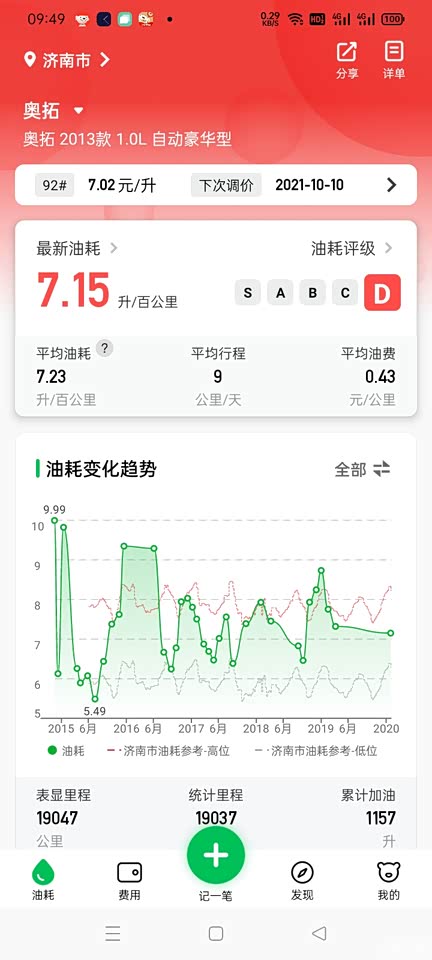 城市道路加市郊道路,油耗平均7.15,因为路程不远,跑不快,所有油耗不是很低,对于小奥拓来说还是有点偏高了。