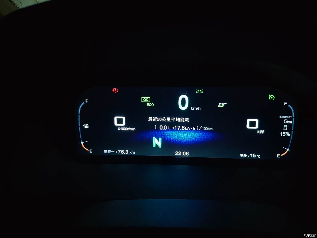 这是纯电行驶了76.3km后的平均能耗:(油0.0L+电17.6kw•h)/100km。