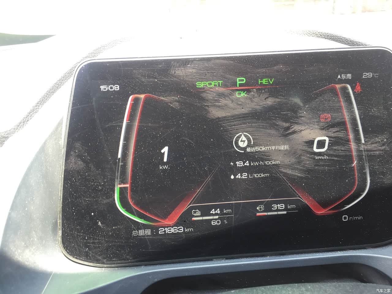 动力没的说满电情况下尤其出众,但是电量大约低于20%明显电机的加持下降非常多。这款发动机拿到现在的标准还是比较弱的。电机的辅助来带的提升非常大,尤其半坡起步很多情况下怠速就可以上。上坡路段堵车放刹车直接就能前进不用踩油门是非常舒服的一件事情。有自己的停车位,充电桩叶装上基本上每次出门都是满电一天开下来很少下到30%。要想电量保持的比较好就要多用动能回收。比亚迪的动能回收还是比较方便。厂家标定的混动节能模式下40KM时速下纯电,时速超过40以上发动机介入的标定还是非常合理的。很多人说踩刹车就有,其实只要车辆在运动不猜油门车辆自己前进时候就在回收。下坡路回收的非常快,走外环路及高速多用动能回收基本上回家都在70%以上。
