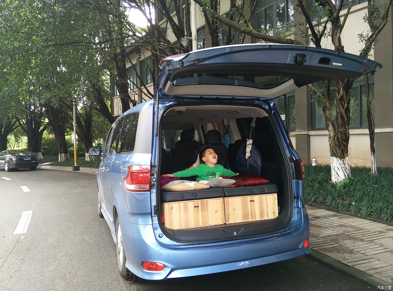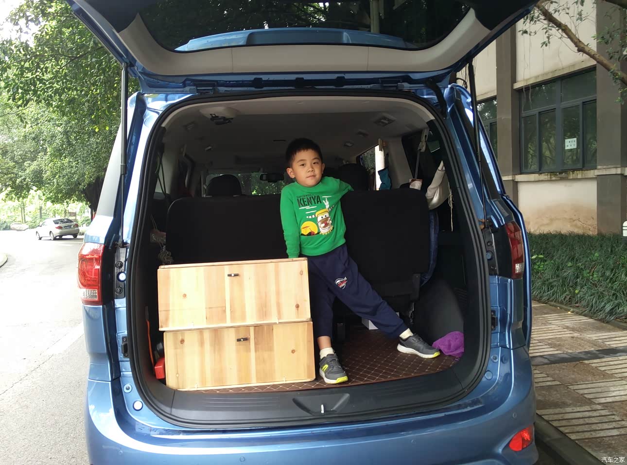 第三排的坐、卧功能是小朋友的最爱。自己动手定制的储物箱兼座椅靠背的支撑加固,放心用。