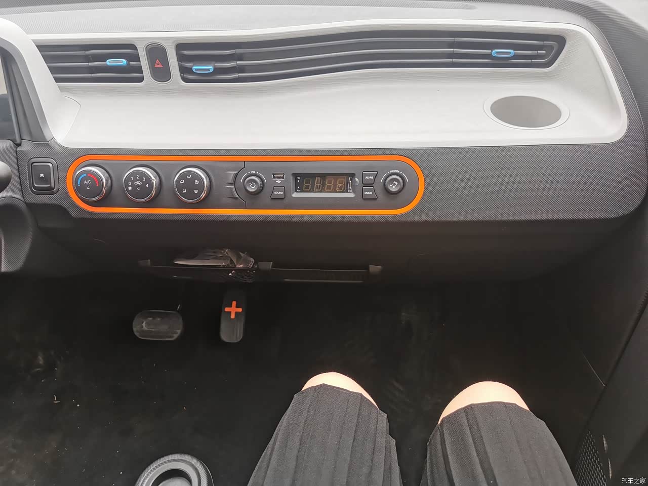 这辆车内饰没有花里胡哨的配置,仅仅只有一个空调控制区和下面那橘色圈内旋钮功能,橘色框内包括了它的所有功能键:空调热冷调节,空调挡数的大小、空调来风的方向等等.......哦~还有收音机!
