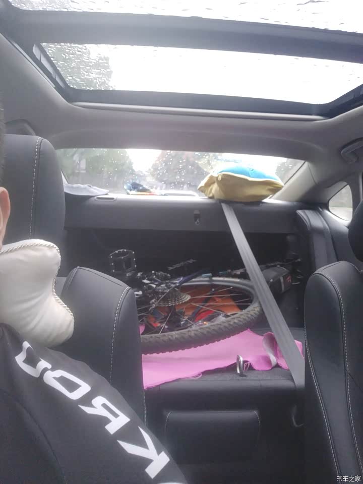 后排座椅放倒,空间大,可以在我山地车不拆的情况下可以整个塞进去,比架车顶稳。