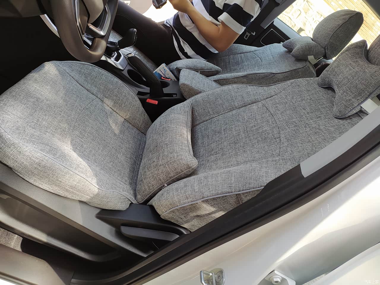 很舒服,网上买了个全包座椅套,如图,贴合很好,不怕谁吐了孩子弄脏了。这个入门级小型SUV空间够用了,买车中了一等奖发了55寸小米电视机,后排没有放倒也在后座上横着装下了。