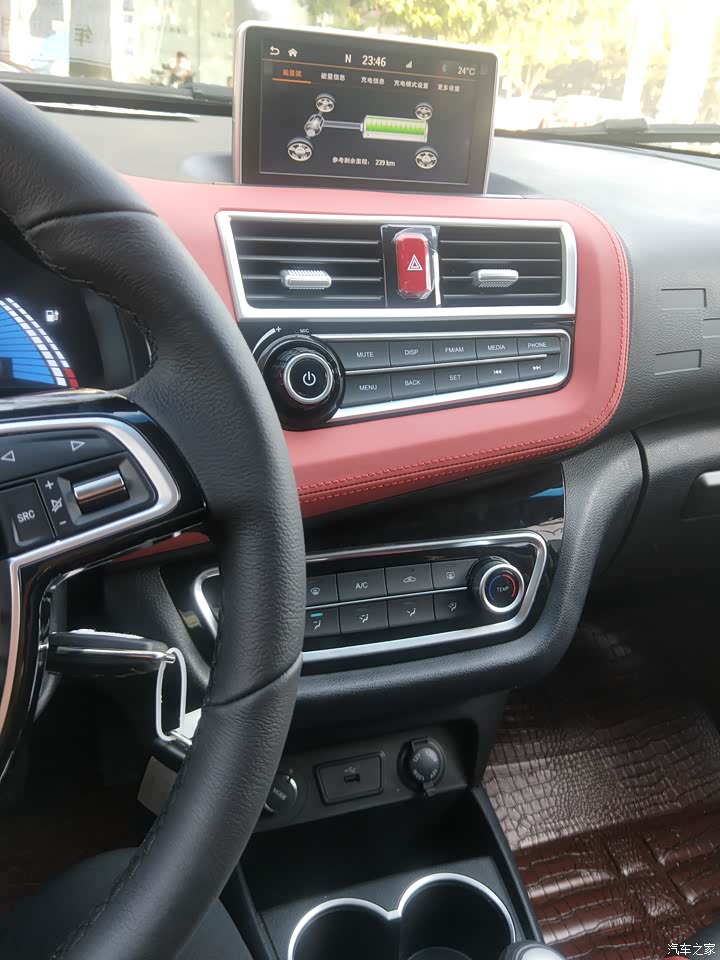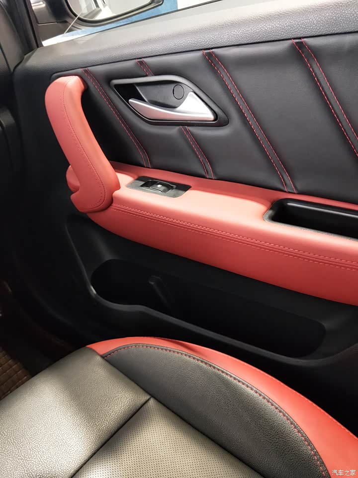 这款车的内饰可以说是整车的一大亮点,红黑搭配的格调配合渡络条的点缀,整个车厢内部时尚气息非常的浓,仪表盘上方区域以及门板内侧采用的软皮革材质包裹,手感很好,双缝线的加入也增添了精致感,所以感觉花五万块钱买到这样的内饰还是很划算的。