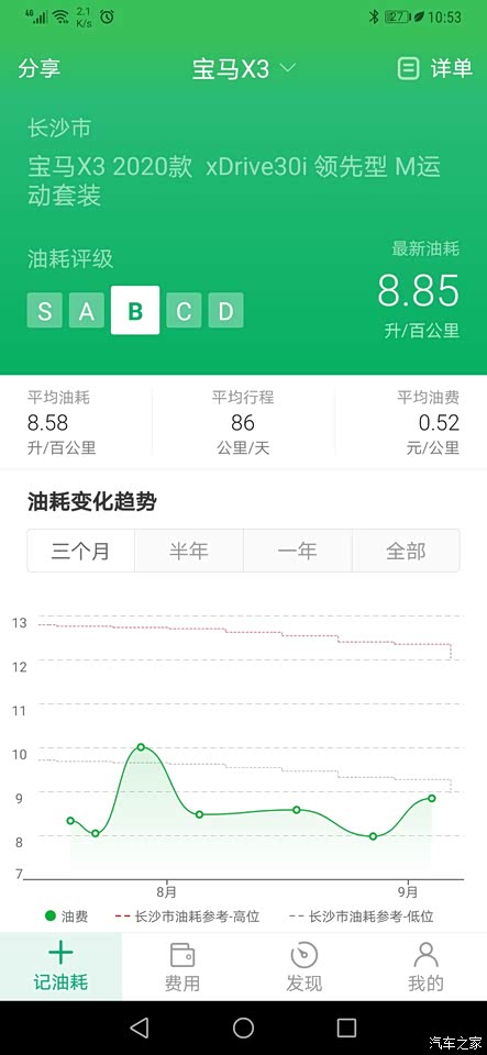 买车以来平均油耗8.58,平均车速30+